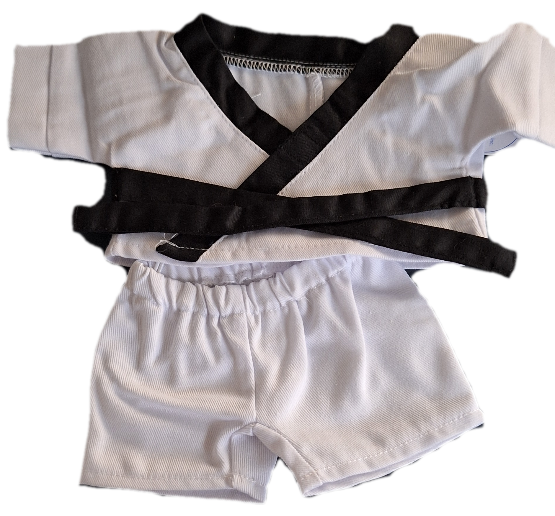 Karatesæt består af top, bukser og bælte. Til lille bamse på 25 cm.